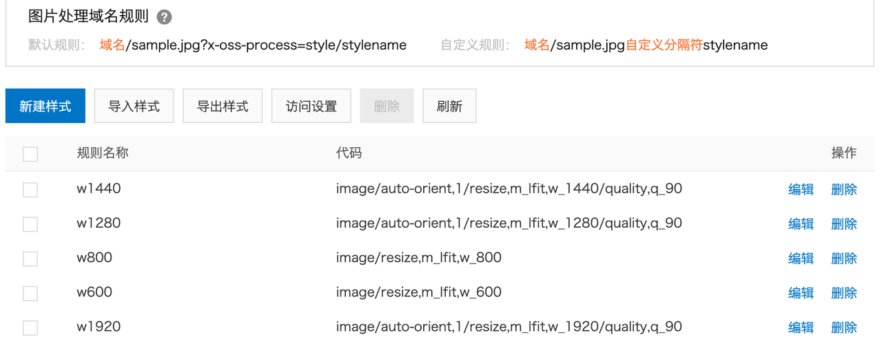 文件夹网址后缀:这是阿里云 OSS 的一个很好用的功能,用于图片处理(如缩略图)。需要去OSS的 图片处理规则 中创建样式。以下是我设置的规则,后缀