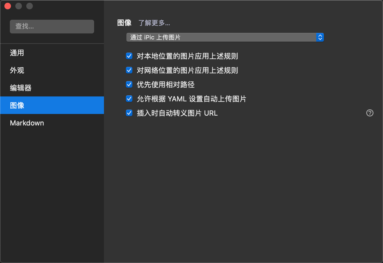 打开 Typora 中的「系统偏好设置 - 图像 - 通过iPic上传图片」选项,在 Typora 中插入本地图片时,i会自动将图片上传图床并使用 Markdown 语法替换文内地址。